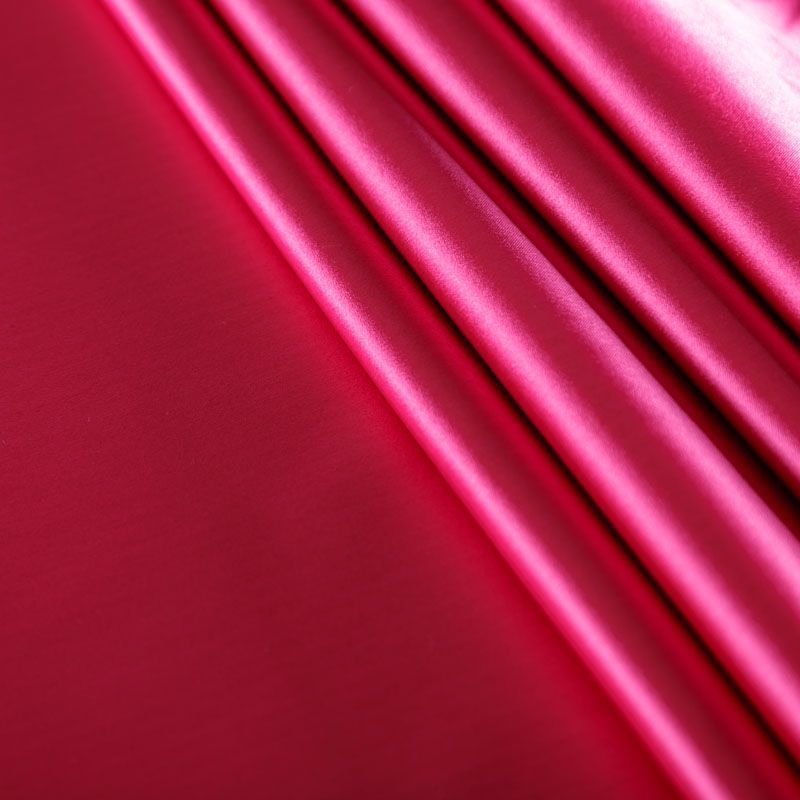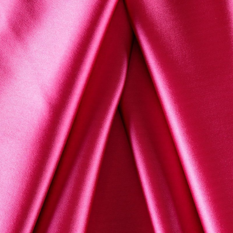 Итальянский костюмно-плательный атлас ватуссо ярко-розового оттенка. Ткань плотная, но пластичная, хорошо держит форму и отлично тянется, собирается в красивые складки и драпировки. Почти не мнется, очень удобный и практичный. Блеск умеренный, смотрится дорого, благородно. Подойдет для пошива прямых силуэтов-футляров, приталенных платьев с пышной юбкой и крупными драпировками, изделий с заложенными складками, нарядных изделий, вечерних костюмов, летнего пальто, юбки, для изготовления корсетов.