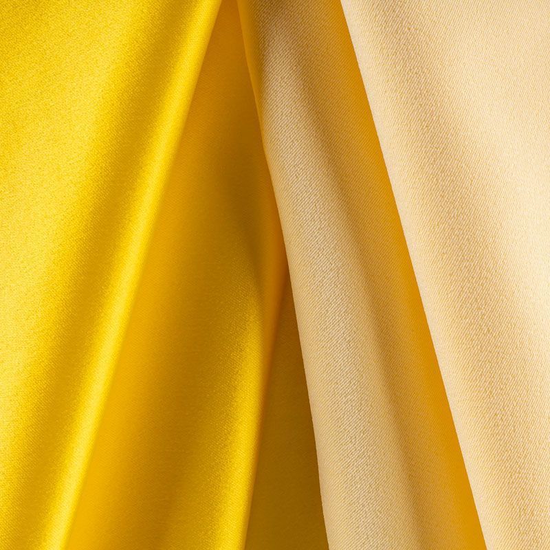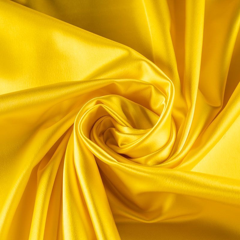 Итальянский костюмно-плательный атлас ватуссо яркого лимонного оттенка. Ткань плотная, но пластичная, хорошо держит форму и отлично тянется, собирается в красивые складки и драпировки. Почти не мнется, очень удобный и практичный. Блеск умеренный, смотрится дорого, благородно. Подойдет для пошива прямых силуэтов-футляров, приталенных платьев с пышной юбкой и крупными драпировками, изделий с заложенными складками, нарядных изделий, вечерних костюмов, летнего пальто, юбки, для изготовления корсетов.