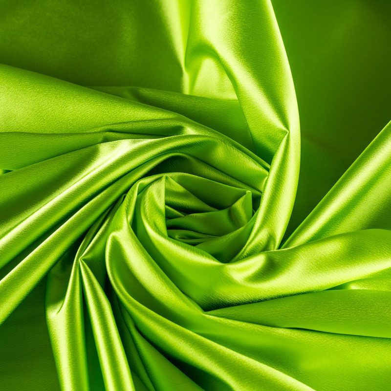 Итальянский костюмно-плательный атлас ватуссо яркого светлого оттенка лайма. Ткань плотная, но пластичная, хорошо держит форму и отлично тянется, собирается в красивые складки и драпировки. Почти не мнется, очень удобный и практичный. Блеск умеренный, смотрится дорого, благородно. Подойдет для пошива прямых силуэтов-футляров, приталенных платьев с пышной юбкой и крупными драпировками, изделий с заложенными складками, нарядных изделий, вечерних костюмов, летнего пальто, юбки, для изготовления корсетов.