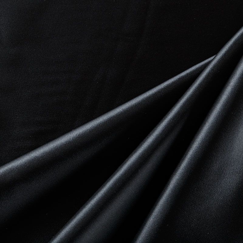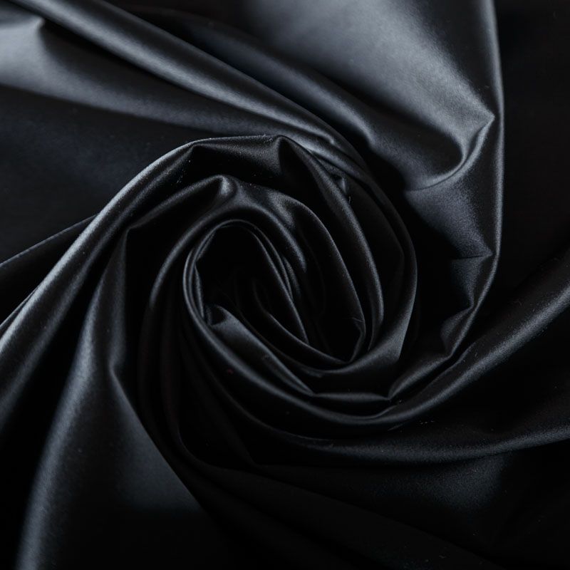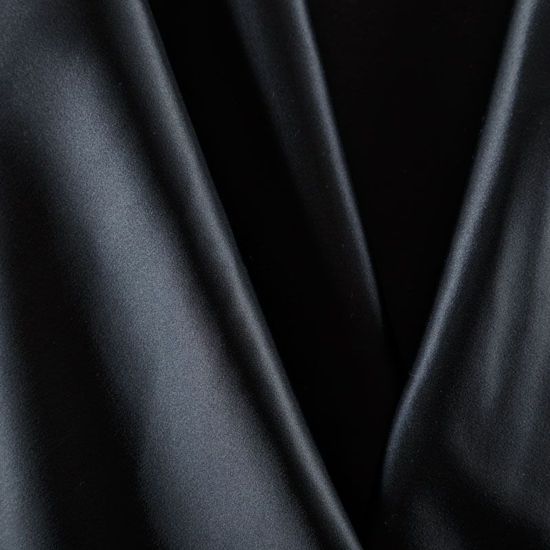Итальянский костюмно-плательный атлас ватуссо черного оттенка. Ткань плотная, но пластичная, хорошо держит форму и отлично тянется, собирается в красивые складки и драпировки. Почти не мнется, очень удобный и практичный. Блеск умеренный, смотрится дорого, благородно. Подойдет для пошива прямых силуэтов-футляров, приталенных платьев с пышной юбкой и крупными драпировками, изделий с заложенными складками, нарядных изделий, вечерних костюмов, летнего пальто, юбки, для изготовления корсетов.