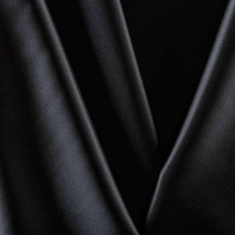 Итальянский костюмно-плательный атлас ватуссо черного оттенка. Ткань плотная, но пластичная, хорошо держит форму и отлично тянется, собирается в красивые складки и драпировки. Почти не мнется, очень удобный и практичный. Блеск умеренный, смотрится дорого, благородно. Подойдет для пошива прямых силуэтов-футляров, приталенных платьев с пышной юбкой и крупными драпировками, изделий с заложенными складками, нарядных изделий, вечерних костюмов, летнего пальто, юбки, для изготовления корсетов.