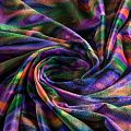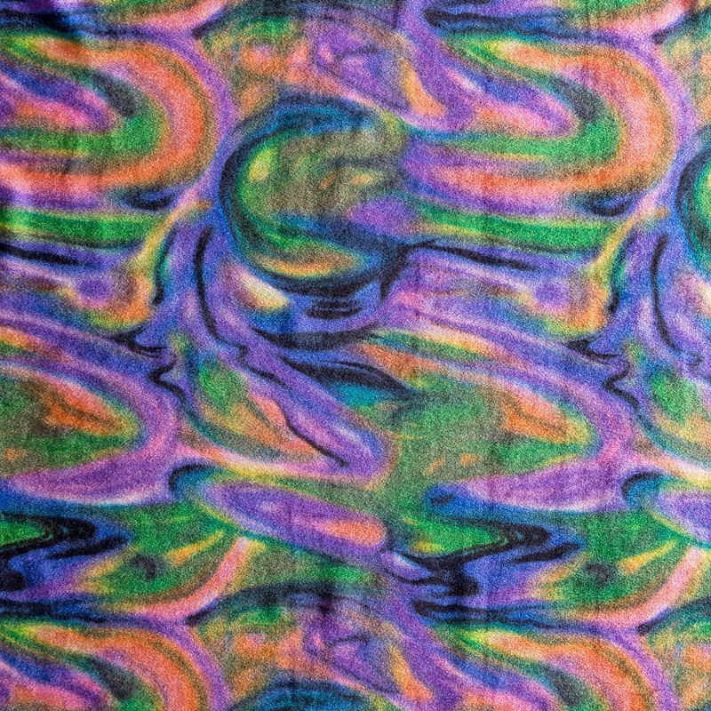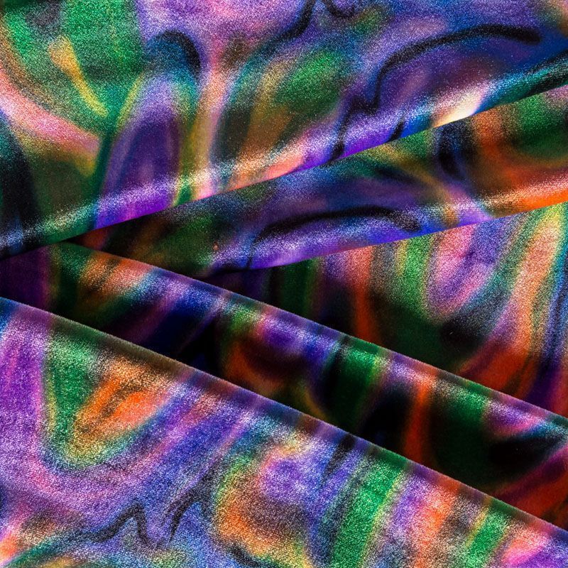 Пластичный, мягкий бархат с абстрактным дизайном в фиолетово-зеленых оттенках. Ткань очень приятна на ощупь, не мнется, хорошо тянется за счет эластана в составе и драпируется. Цвет играет отблесками и полутонами. Бархат идеально подходит для пошива вечерних платьев, юбок, костюмов, а также стильных аксессуаров.
