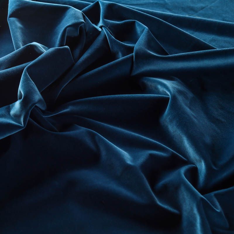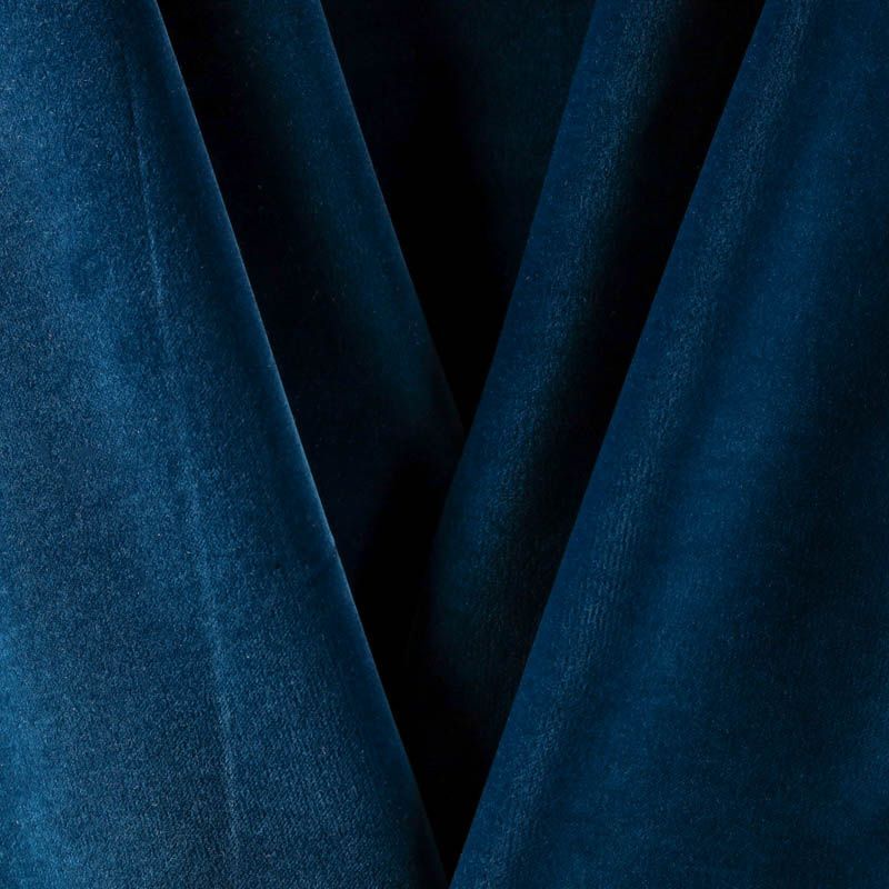 Плотный бархат из хлопка глубокого синего цвета с добавлением небольшого процента эластана. Ткань очень приятная на ощупь, пластична, но держит форму, а также прочна - идеальна для нарядного костюма, жакета в классическом стиле, юбки, жилета, комбинезона, брюк, платья-футляра.