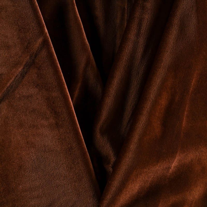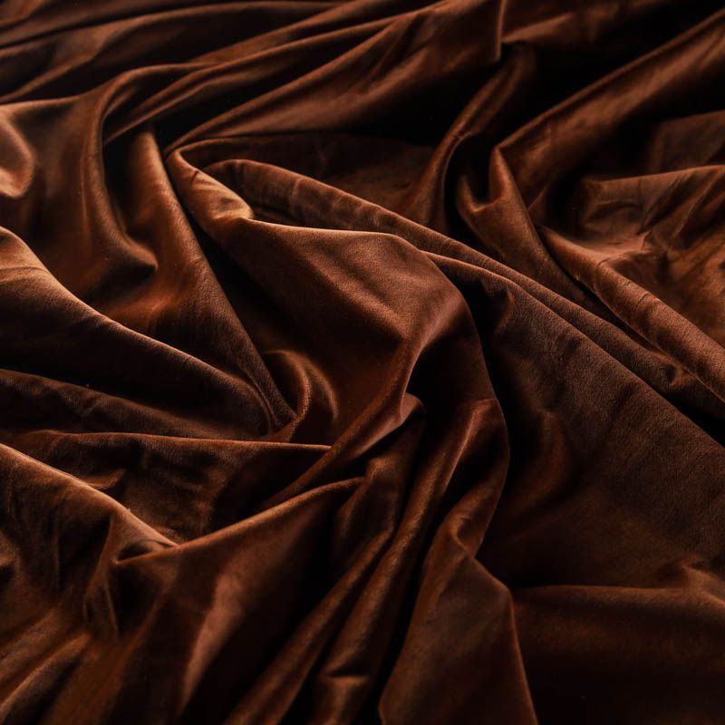 Хлопковый итальянский бархат насыщенного коричневого цвета. Ткань плотная, мягкая с коротким ворсом. Не грубая, хорошо драпируется. Имеет благородный матовый оттенок. Подойдет для пошива нарядного костюма, жакета, юбки, жилета, шорт, комбинезонов, брюк, платья-футляр, легкого пальто или бомбера.