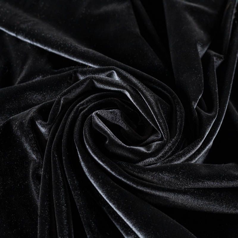 Ткань плотная, тяжелая и ниспадающая, прекрасно драпируется, хорошо тянется, не мнется. Имеет густой ворс, цвет играет отблесками и полутонами. Идеально подойдет для пошива длинных облегающих вечерние нарядов, платья с драпировками, брюк, юбок, свитшотов, костюмов в спортивном и пижамном стиле.