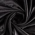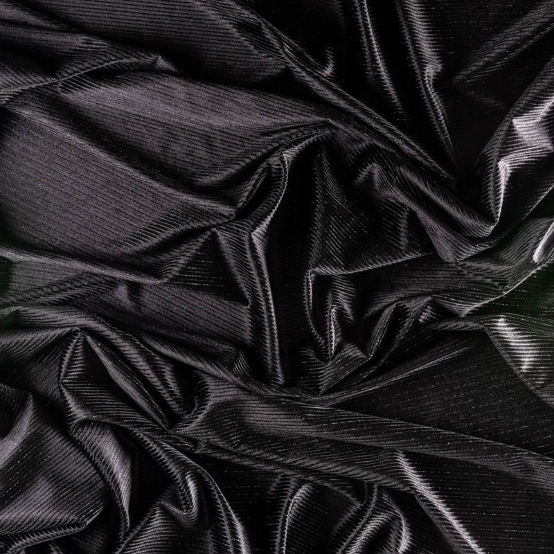 Бархат с выработкой в рубчик, как на вельвете глубокого черного цвета с люрексовой нитью. Ткань очень приятна на ощупь, не мнется, мягкая, нежная, хорошо тянется и драпируется. Цвет играет отблесками и полутонами. Бархат идеально подходит для пошива вечерних платьев, юбок, костюмов, а также стильных аксессуаров.