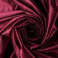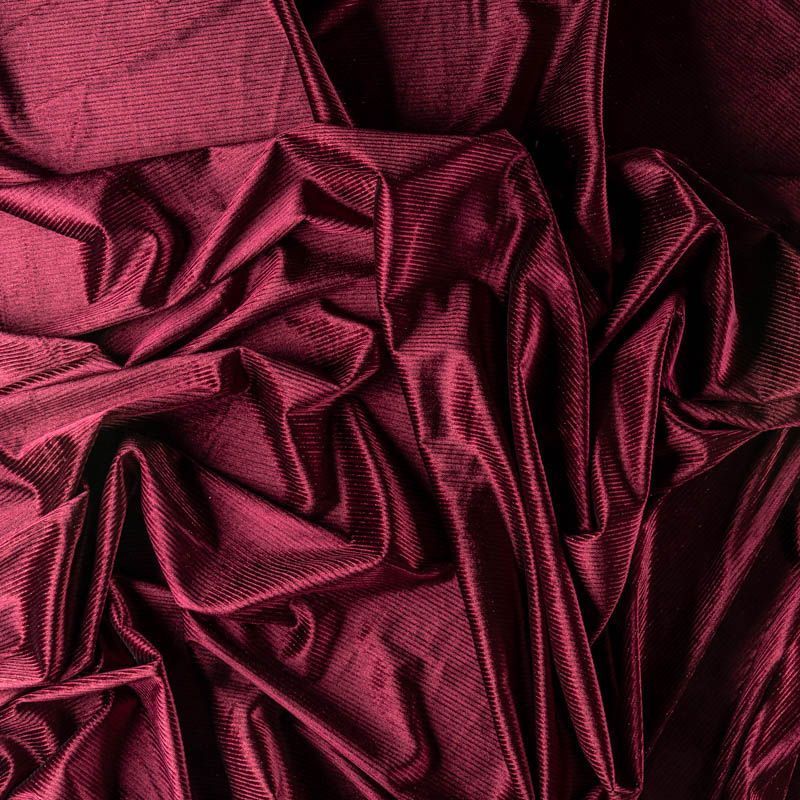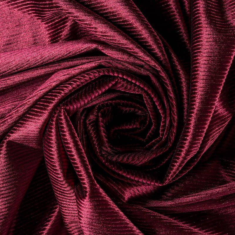Бархат с выработкой в рубчик, как на вельвете цвета марсала с люрексовой нитью. Ткань очень приятна на ощупь, не мнется, мягкая, нежная, хорошо тянется и драпируется. Цвет играет отблесками и полутонами. Бархат идеально подходит для пошива вечерних платьев, юбок, костюмов, а также стильных аксессуаров.
