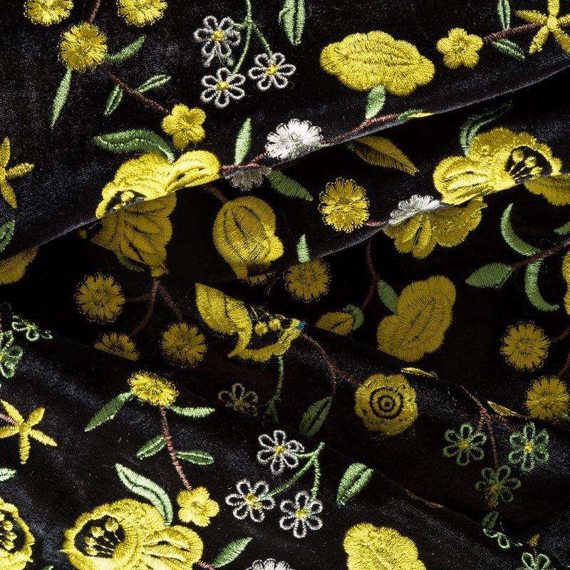 Итальянский бархат черного цвета, декорирован вышивкой фантазийными цветами в желтых оттенках, расположенной по всему полотну.  Ткань приятная на ощупь, хорошо драпируется и держит форму, обладает благородным блеском, тянется за счет эластана в составе. Прекрасно подойдет для жакета, юбки, костюма, жилета, платья.