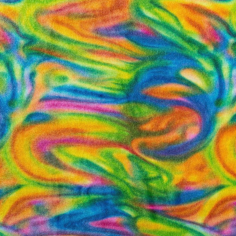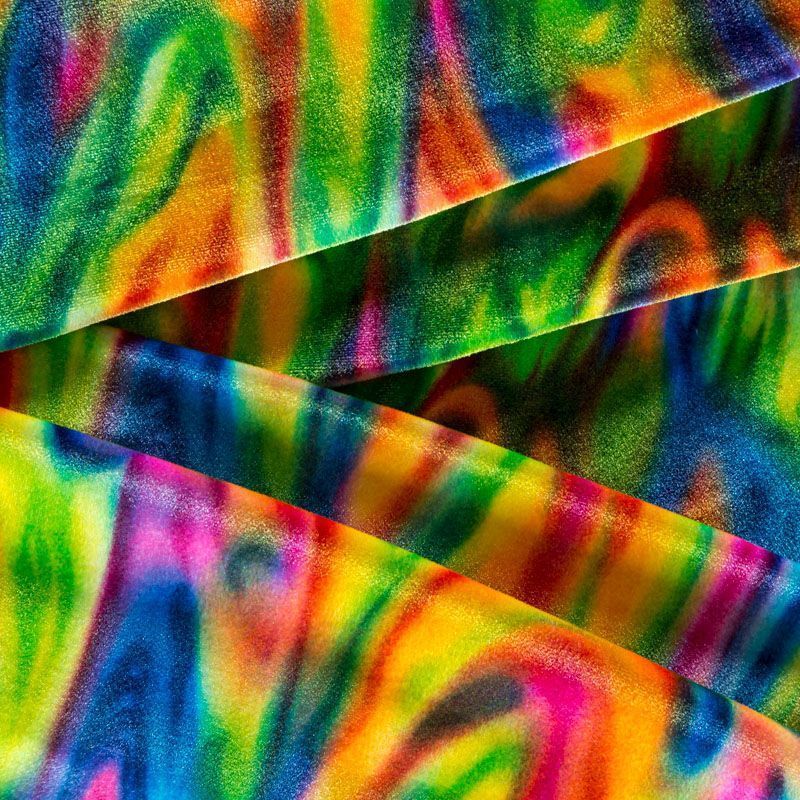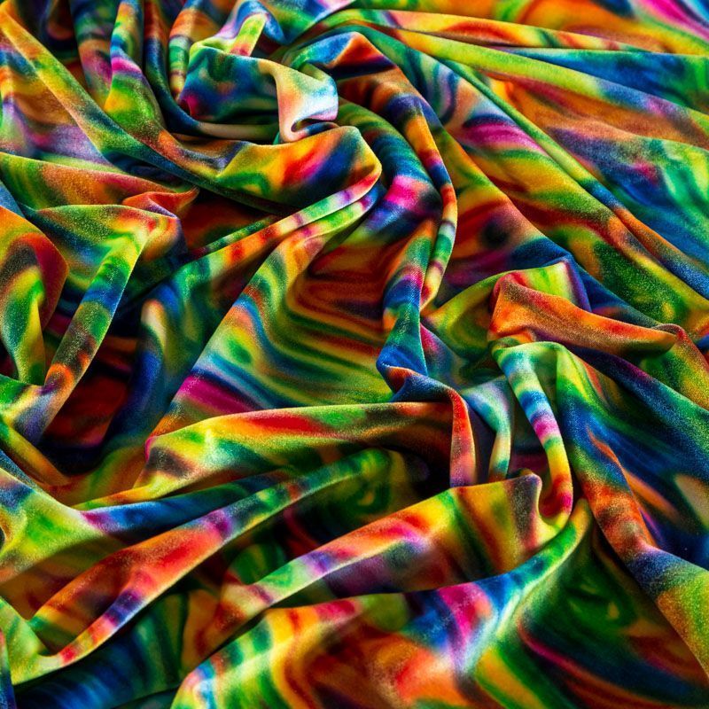 Пластичный, мягкий бархат с абстрактным дизайном в желтых, оранжевых, синих и зеленых оттенках. Ткань очень приятна на ощупь, не мнется, хорошо тянется за счет эластана в составе и драпируется. Цвет играет отблесками и полутонами. Бархат идеально подходит для пошива вечерних платьев, юбок, костюмов, а также стильных аксессуаров.