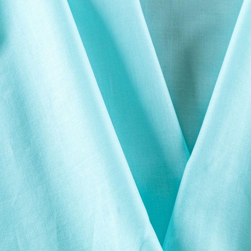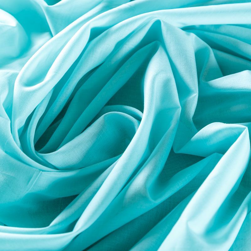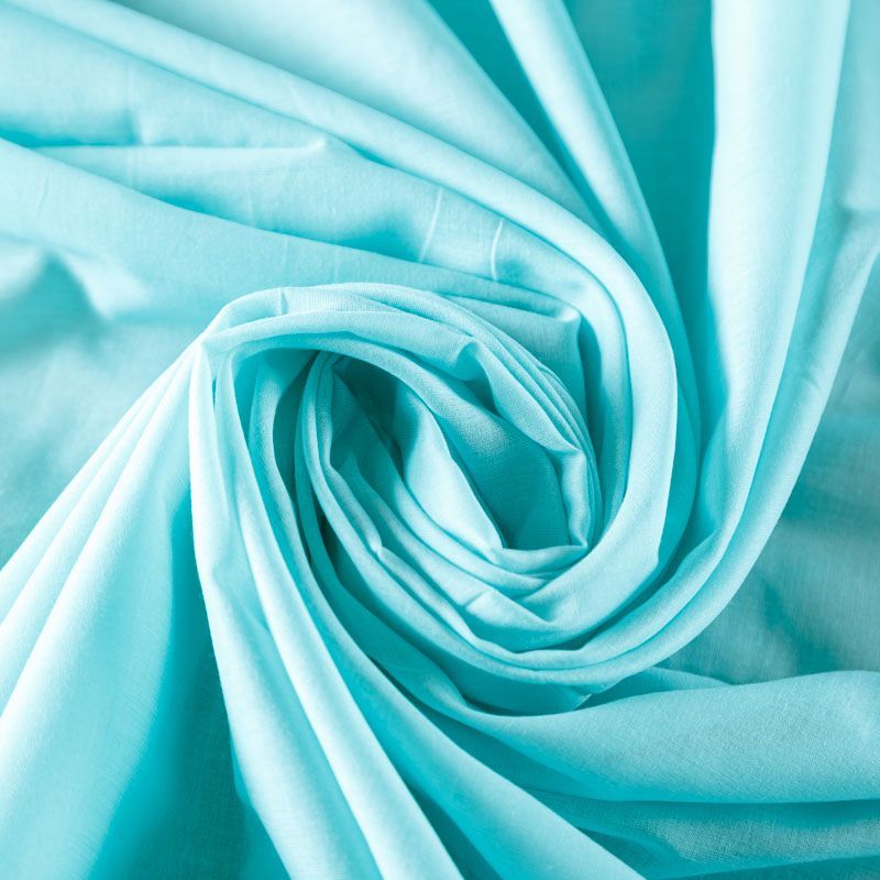 Итальянский хлопковый батист в бирюзовом оттенке, тонкий, легкий, полупрозрачный, приятный на ощупь, нежный, хорошо и мягко драпируется, летящий. Батист подойдёт для модных блуз с объёмными рукавами, летних платьев и сарафанов с длинной летящей юбкой, прозрачных рубашек, декорированных объёмными бантами, детской одежды.