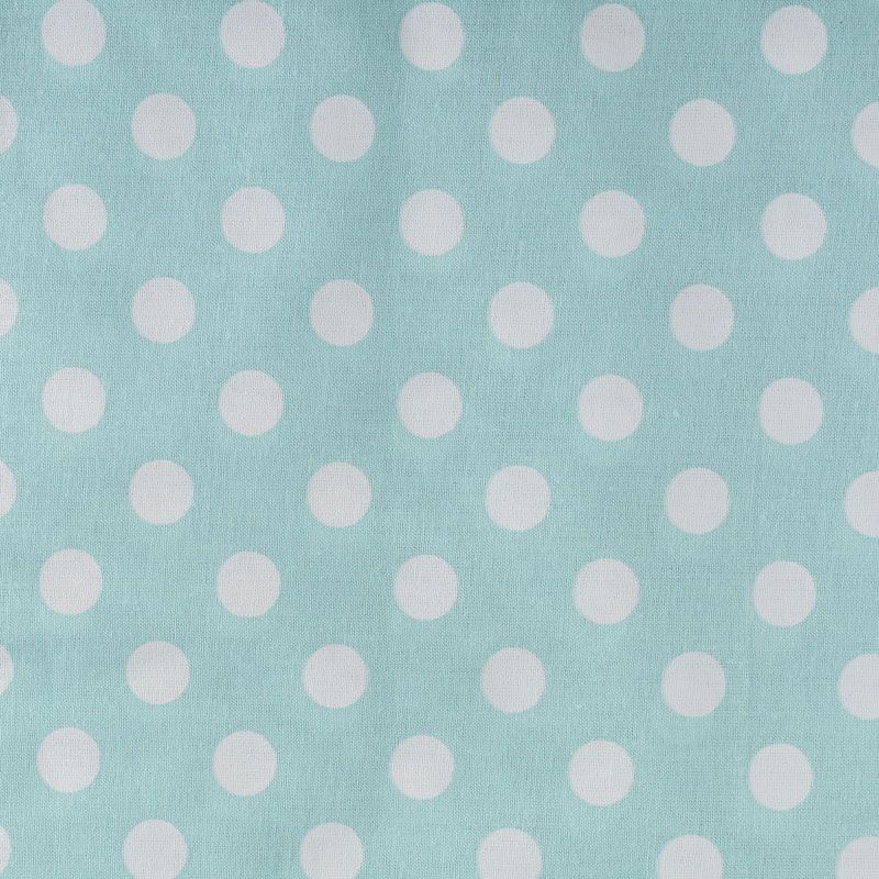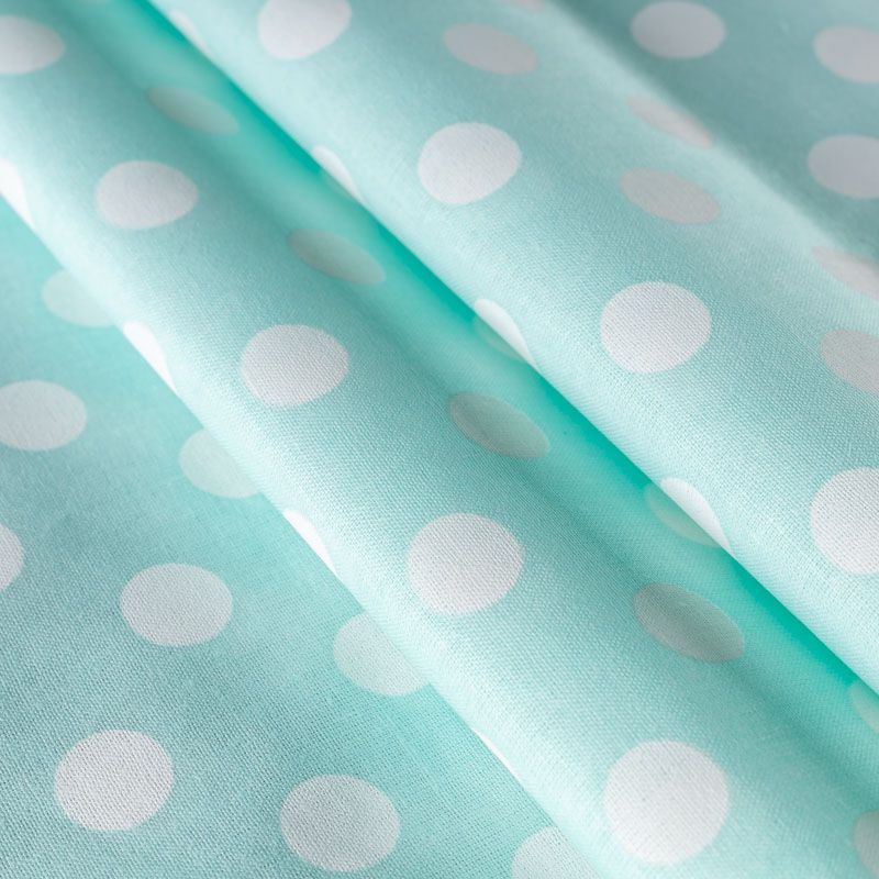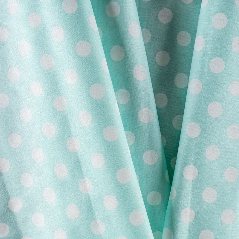 Плотная натуральная ткань с особым принципом переплетения нитей: крест-накрест. Имеет гладкую матовую поверхность чуть шероховатую на ощупь, не тянется, немного просвечивает. Прочная и стойкая к износу, надолго сохраняет яркость красок, не растягивается при стирке, практически не мнется. Принт в белый горошек среднего размера (1,5 см) на ментоловом фоне прекрасно подойдет для пошива постельного белья, изготовления пеленок, бортиков для кроватки, домашней одежды и других предметов интерьера.