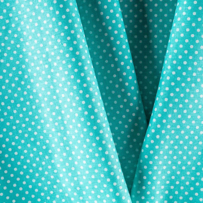 Плотная натуральная ткань с особым принципом переплетения нитей: крест-накрест. Имеет гладкую матовую поверхность чуть шероховатую на ощупь, не тянется, немного просвечивает. Прочная и стойкая к износу, надолго сохраняет яркость красок, не растягивается при стирке, практически не мнется. Мелкий белый горошек (3 мм) на ярком мятно-бирюзовом фоне прекрасно подойдет для пошива постельного белья, изготовления пеленок, бортиков для кроватки, домашней одежды и других предметов интерьера.