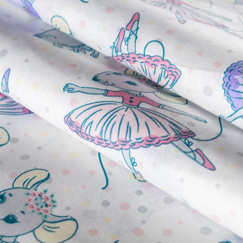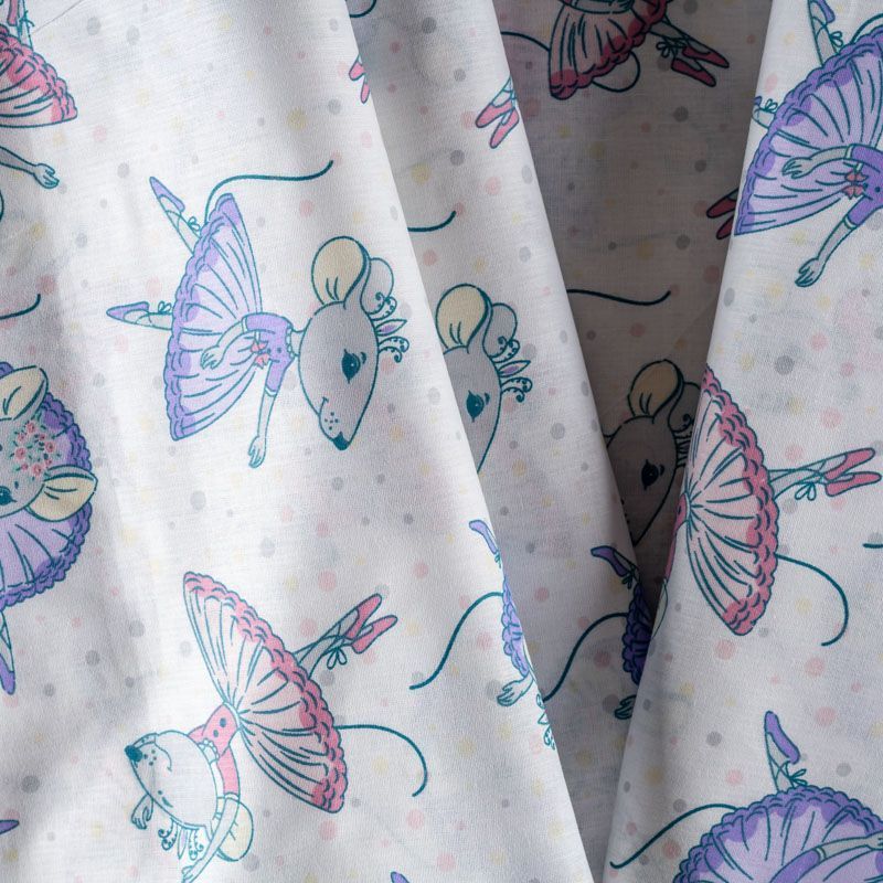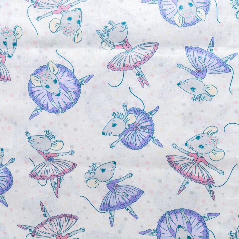 Плотная натуральная ткань с особым принципом переплетения нитей: крест-накрест. Имеет гладкую матовую поверхность, немного шероховатая на ощупь, не тянется, немного просвечивает. Прочная и стойкая к износу, надолго сохраняет яркость красок, практически не мнется. Милый детский принт в виде танцующих принцесс-мышек на белом фоне прекрасно подойдет для пошива постельного белья, изготовления пеленок, бортиков для кроватки, домашней одежды и других предметов интерьера.
