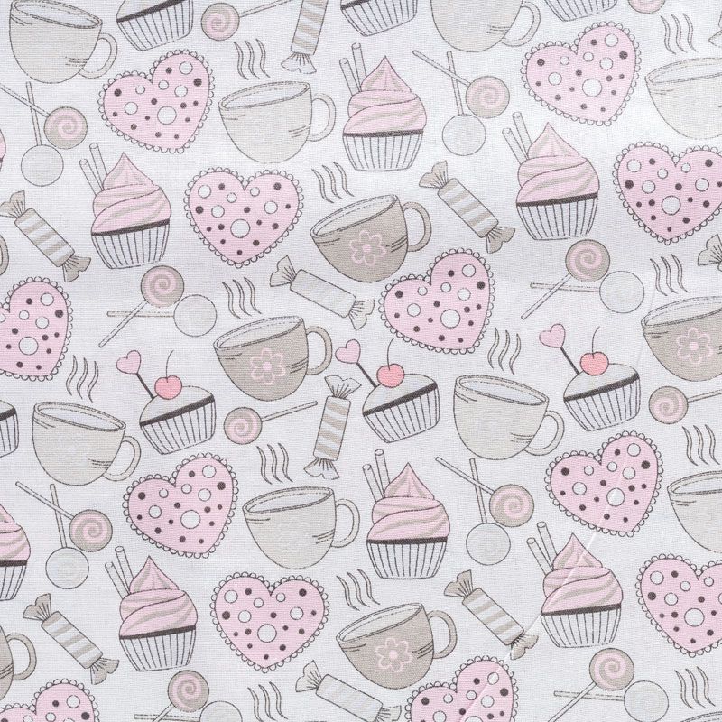 Плотная натуральная ткань с особым принципом переплетения нитей: крест-накрест. Имеет гладкую матовую поверхность чуть шероховатую на ощупь, не тянется, немного просвечивает. Прочная и стойкая к износу, надолго сохраняет яркость красок, не растягивается при стирке, практически не мнется. Нежный и милый принт в виде стилизованных сладостей в пастельных тонах на белом фоне прекрасно подойдет для пошива домашней одежды: халатов, пижамы, ночной сорочки, а также для изготовления пеленок, детского постельного белья, бортиков для кроватки.