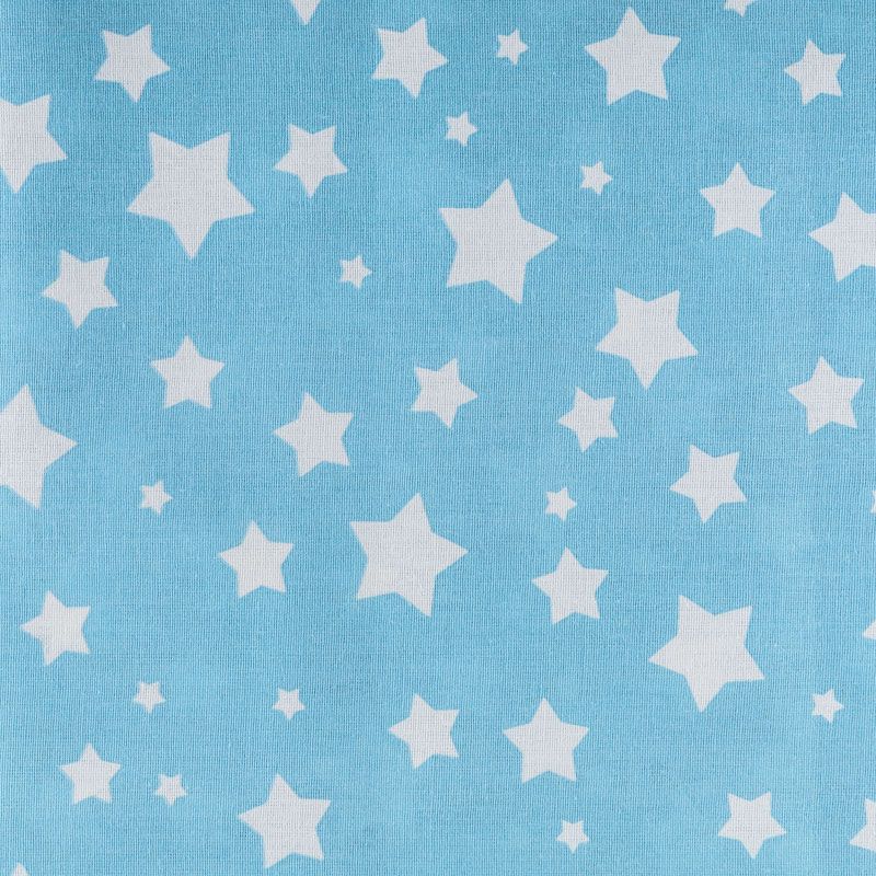Плотная натуральная ткань с особым принципом переплетения нитей: крест-накрест. Имеет гладкую матовую поверхность чуть шероховатую на ощупь, не тянется, немного просвечивает. Прочная и стойкая к износу, надолго сохраняет яркость красок, не растягивается при стирке, практически не мнется. Принт в виде белых звездочек разного размера на небесно-голубом фоне прекрасно подойдет для пошива постельного белья, изготовления пеленок, бортиков для кроватки, домашней одежды и других предметов интерьера.