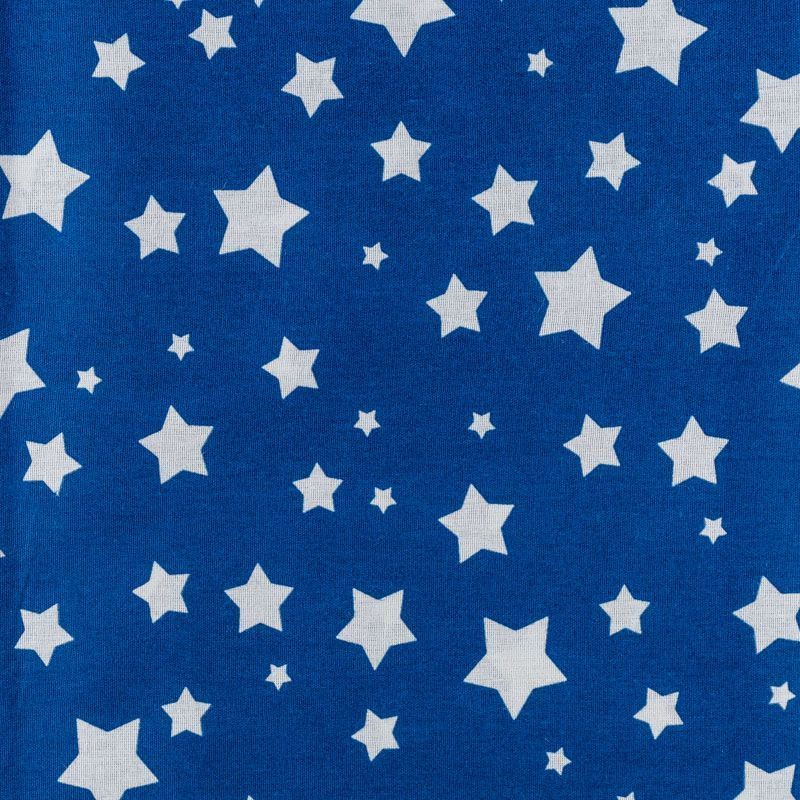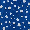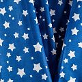 Плотная натуральная ткань с особым принципом переплетения нитей: крест-накрест. Имеет гладкую матовую поверхность чуть шероховатую на ощупь, не тянется, немного просвечивает. Прочная и стойкая к износу, надолго сохраняет яркость красок, не растягивается при стирке, практически не мнется. Принт в виде  белых звездочек разного размера на глубоком синем фоне прекрасно подойдет для пошива постельного белья, изготовления пеленок, бортиков для кроватки, домашней одежды и других предметов интерьера.