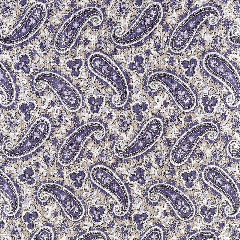 Плотная натуральная ткань с особым принципом переплетения нитей: крест-накрест. Имеет гладкую матовую поверхность, немного шероховатая на ощупь, не тянется, немного просвечивает. Прочная и стойкая к износу, надолго сохраняет яркость красок, практически не мнется. Восточный принт пейсли на спокойном сером фоне прекрасно подойдет для пошива постельного и столового белья, изготовления домашней одежды и других предметов интерьера.