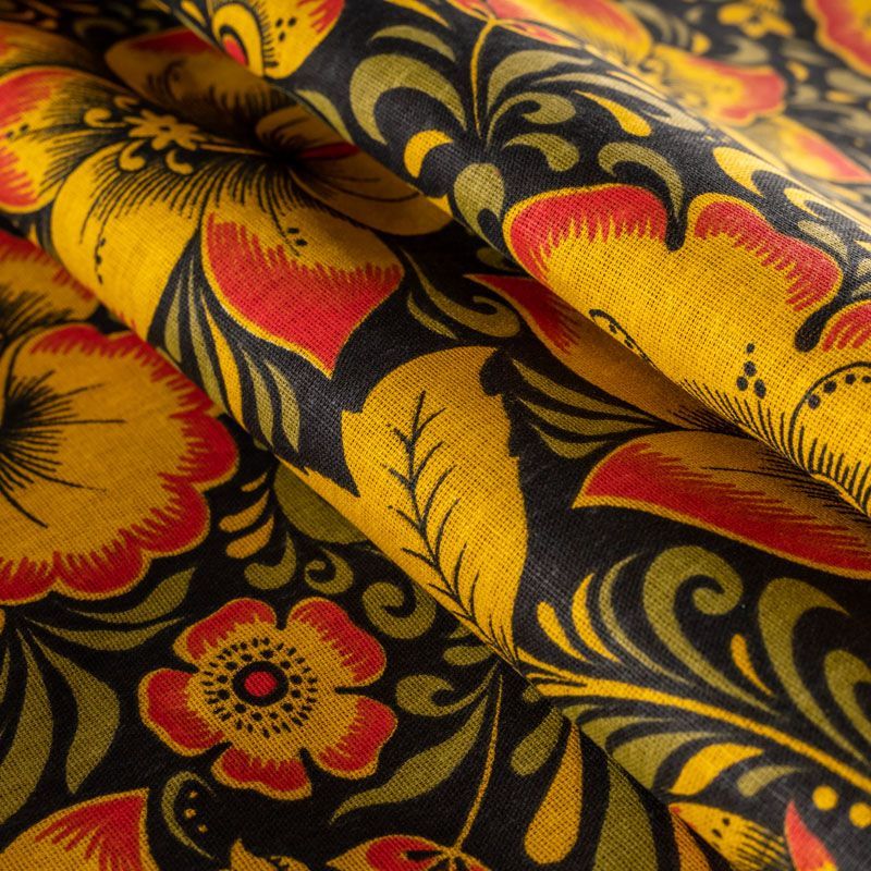 Плотная натуральная ткань с особым принципом переплетения нитей: крест-накрест. Имеет гладкую матовую поверхность, немного шероховатая на ощупь, не тянется, немного просвечивает. Прочная и стойкая к износу, надолго сохраняет яркость красок, практически не мнется. Яркий узнаваемый принт по мотивам народного творчества на черном фоне прекрасно подойдет для пошива постельного и столового белья, изготовления сценических костюмов, домашней одежды и других предметов интерьера.