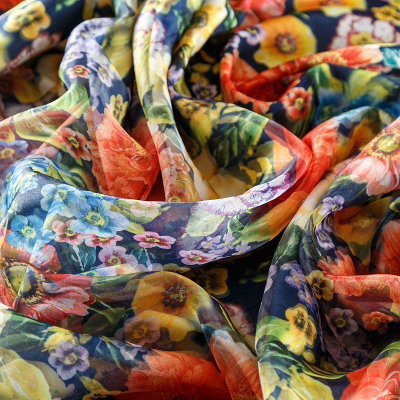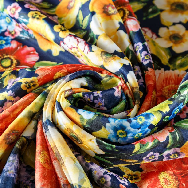 Трикотажное полотно средней плотности с цветочным принтом и слоем органзы. Обе стороны ткани ровные, гладкие. Материал эластичный, имеет растяжимость по всем сторонам, хорошо держит форму, уютный, приятный к телу и удобный в носке. Применяется в пошиве платьев, юбок, костюмов, жакетов.