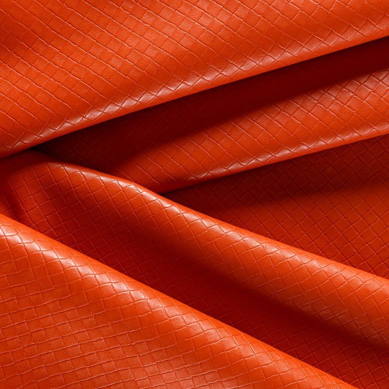 Экокожа в оранжевом оттенке с объемной фактурой, имитирующей плетенку. Очень приятная на ощупь, пластичная. Подойдет для пошива платья, брюк, шорт, юбки, куртки, плаща, пальто-рубашки, а также сумки, рюкзака и других аксессуаров.