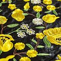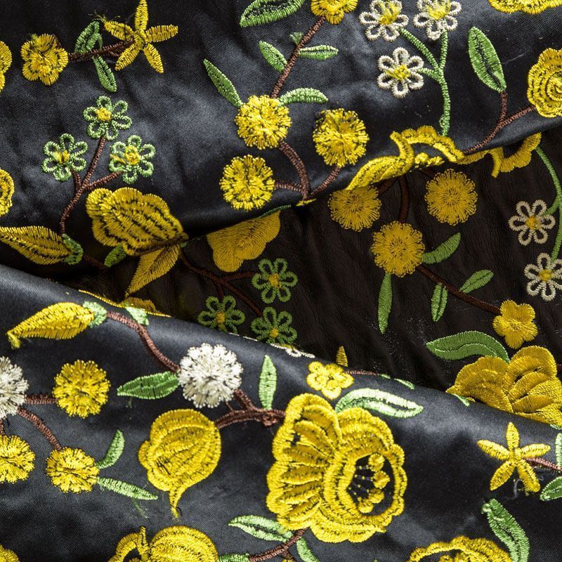Искусственный материал, имитирующий натуральную кожу черного цвета с богатой объемной цветочной вышивкой в желтых оттенках. Поверхность ткани полуматовая, гладкая. Приятная на ощупь, держит форму, не просвечивает, пластичная. Подойдет для пошива куртки, костюма, платья, юбки, брюк, шорт, комбинезона, сумки, рюкзака.