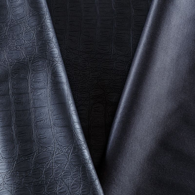 Искусственный материал, имитирующий натуральную кожу рептилии, на черной трикотажной основе. Экокожа тоньше натуральной, не мнется, пластична, хорошо тянется за счет эластана в составе, облегает фигуру. Подойдет для пошива куртки, костюма, платья, юбки, брюк, шорт, комбинезона, сумки, рюкзака.