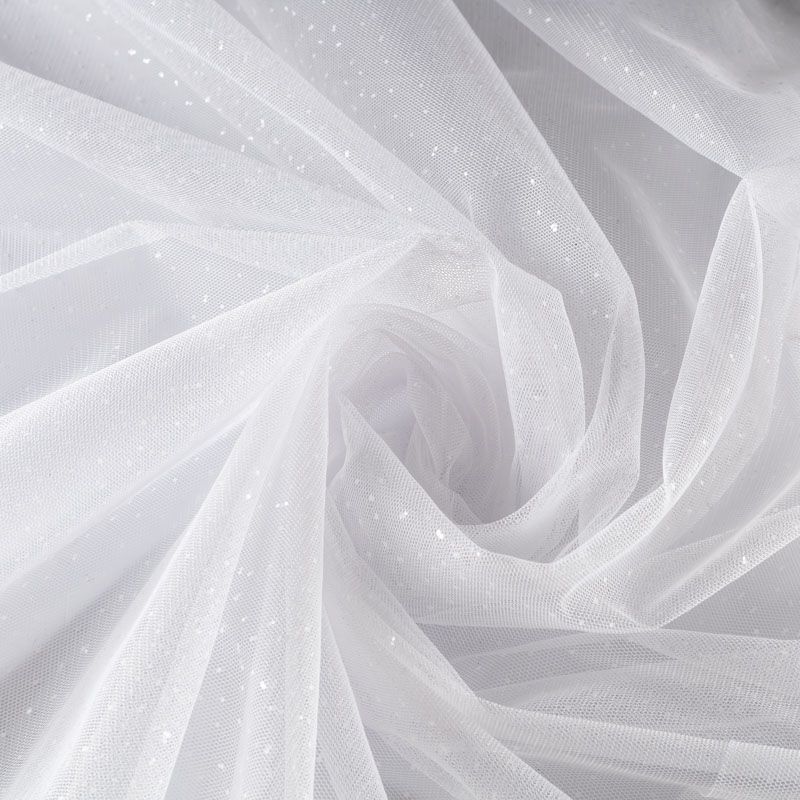 Полотно мягкое и матовое с искрящимися блестками. Неплохо драпируется в  слегка держащие форму складки, имеет мелкое сетчатое плетение, прияный на ощупь. Подойдет для пошива платья, юбки-пачки, фаты и других коктейльных и вечерних нарядов или аксессуаров.
