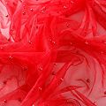 Тонкая прозрачная сетка средней жесткости красного оттенка декорирована не крупными бусинами в тон полотна. Используется для пошива одежды для различных праздников, концертов, пышных юбок, платьев, а также для отделки и украшения, создания предметов декора и украшения помещений для торжественных мероприятий.