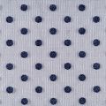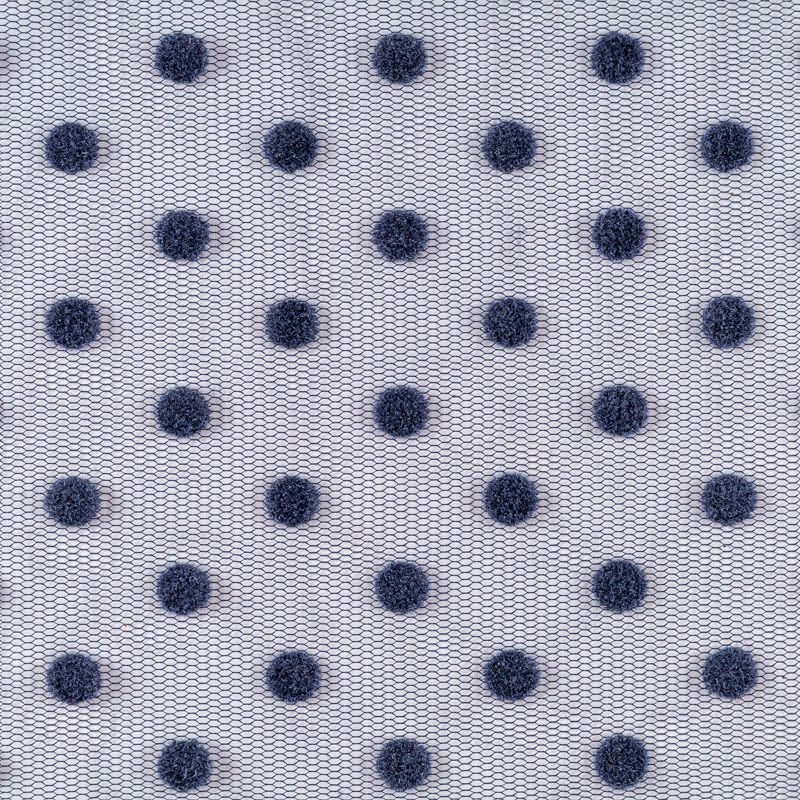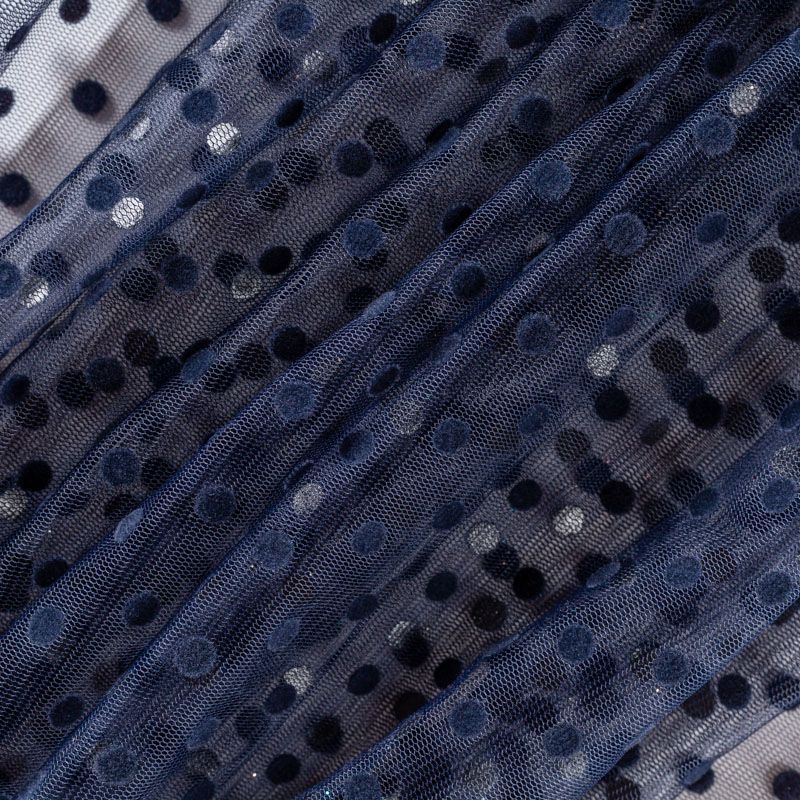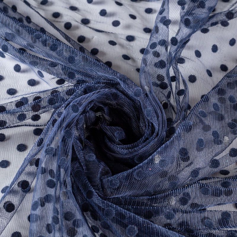 Нежный, мягкий и матовый фатин темно-синего оттенка. На лицевой стороне  объемные декоративные горошки среднего размера из флока. Хорошо драпируется, имеет мелкое сетчатое плетение, прияный на ощупь. Из него получатся нежные и воздушные наряды — пышные юбки-пачки, коктельные или вечерние платья.