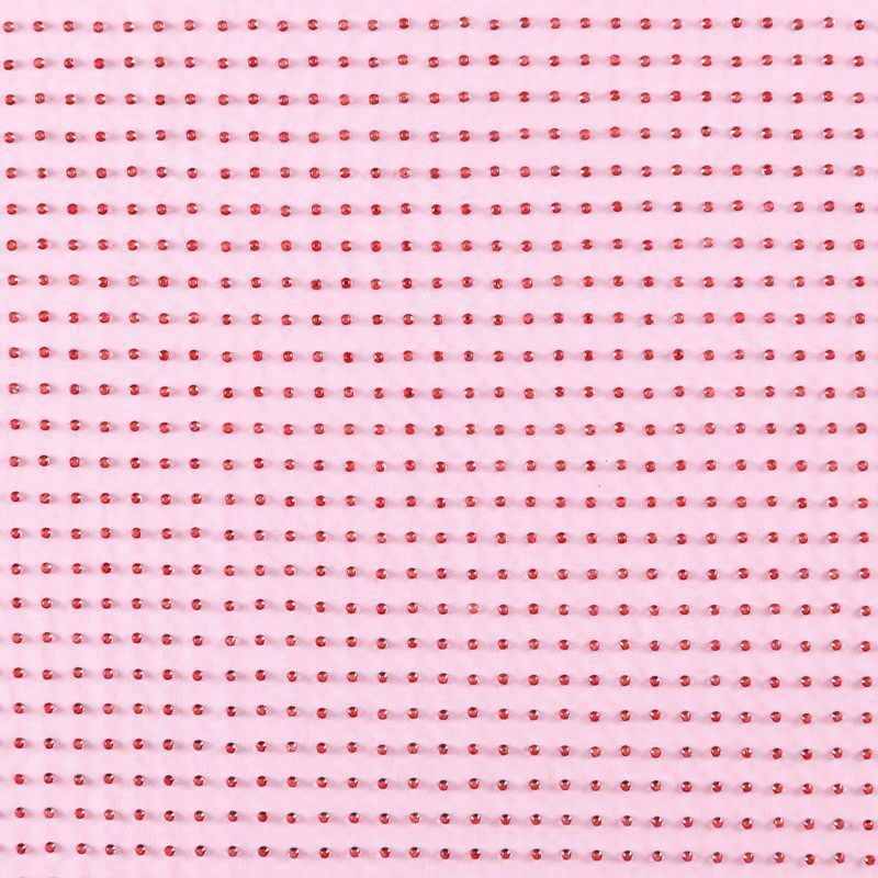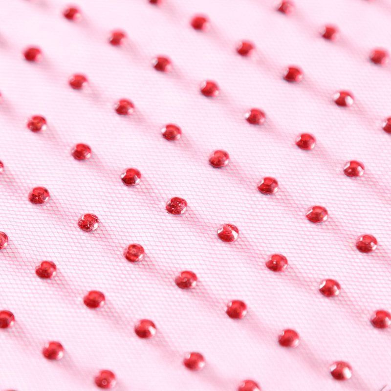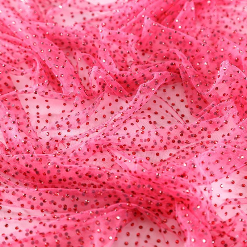 Тонкая прозрачная сетка средней жесткости малинового оттенка декорирована клеевыми стразами в тон полотна. Используется для пошива одежды для различных праздников, концертов, пышных юбок, платьев, а также для отделки и украшения, создания предметов декора и украшения помещений для торжественных мероприятий.