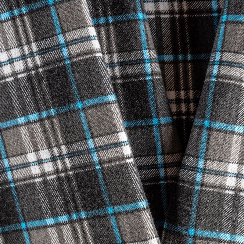 Износостойкий мягкий материал, не раздражает кожу, не садится, отлично впитывает влагу и хорошо удерживает тепло. На лицевой стороне мягкий ворс. Классический клетчатый принт с серо-голубых оттенках прекрасно подойдет для пошива домашней одежды, теплой пижамы, халата, рубашек различного фасона.