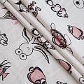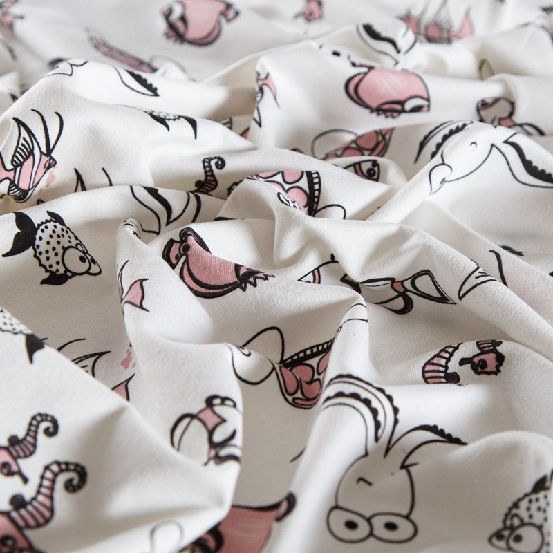 Итальянский хлопковый мягкий эластичный трикотаж средней плотности. Лицевая сторона гладкая, без блеска, мелкой вязки с детским принтом. Изнанка – с небольшим однородным ворсом или петля. Прекрасный вариант для пошива платьев и костюмов, легких толстовок, свитшотов, спортивной, детской и  домашней одежды.