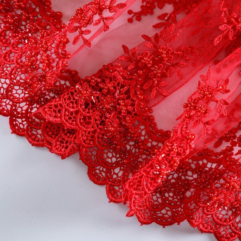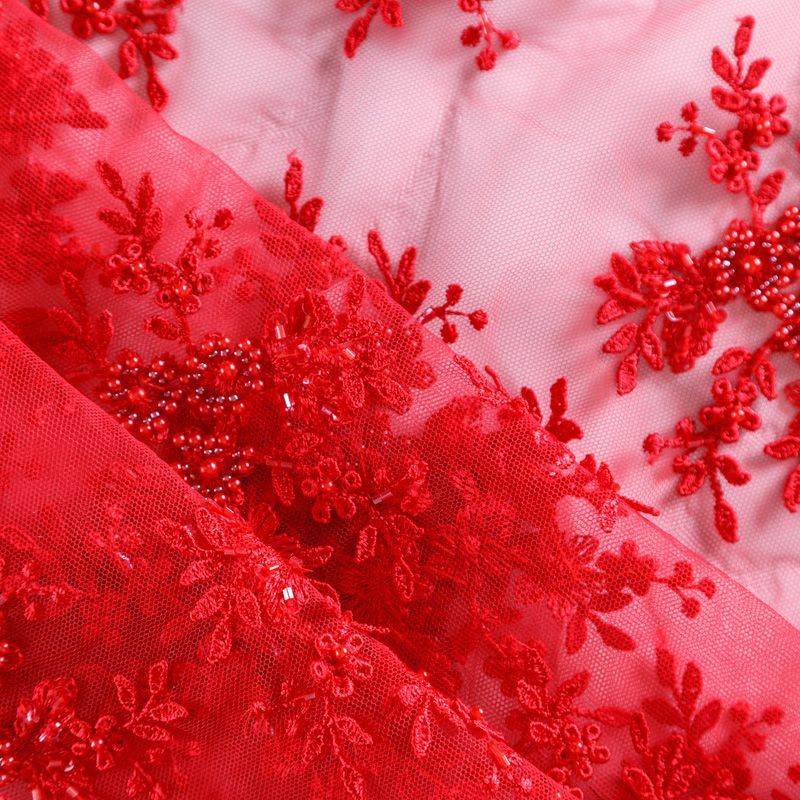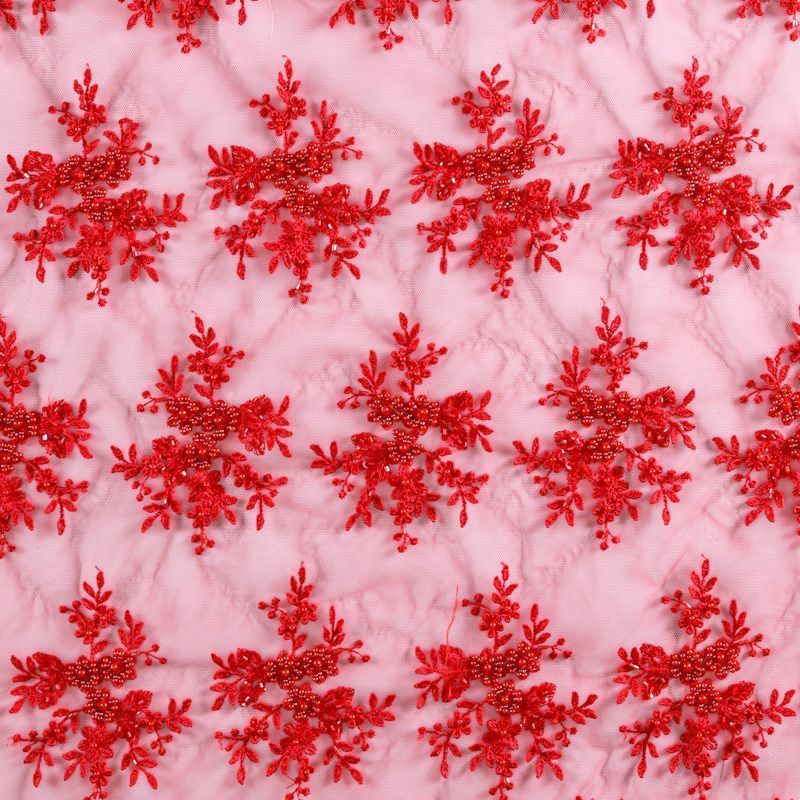 Вышивка на сетке красного оттенка с флористическим узором. Полотно мягкое, легкое и пластичное, хорошо тянется. Сетка не жесткая, приятная к телу. Узор вышит мягкой пряжей, образуя красивую фактуру, имитирующую ручную вышивку, и оформлен бисером. С обеих сторон ткань украшена симметричными фестонами, что придает полотну законченный и нарядный вид. Великолепно будет смотреться в нарядном вечернем платье, платье на выпускной бал, в блузках, топах. Набирается для изделия объемом.