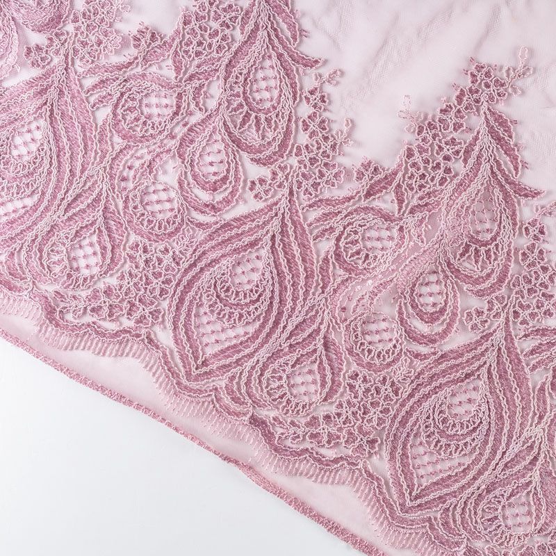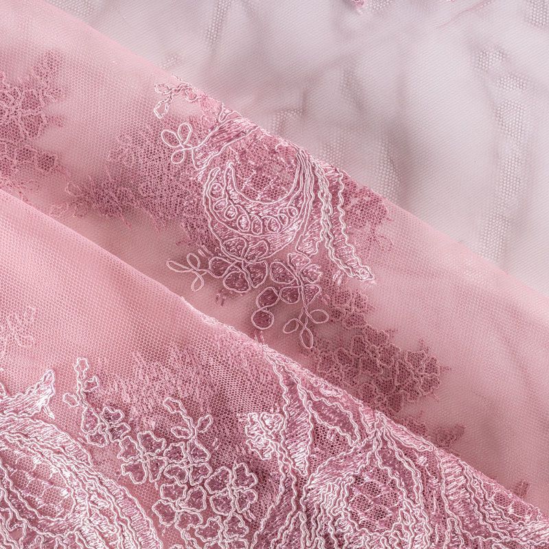 Вышивка на сетке приглушенного розового оттенка с крупным фантазийным узором в виде пера жар-птицы. Полотно мягкое, легкое и пластичное, хорошо тянется. Сетка не жесткая, приятная к телу. Узор вышит мягкой пряжей, образуя красивую фактуру, имитирующую ручную вышивку, и оформлен кордовой нитью. С обеих сторон ткань украшена симметричными фестонами, что придает полотну законченный и нарядный вид. Великолепно будет смотреться в нарядном вечернем платье, платье на выпускной бал, в блузках, топах. Набирается для изделя объемом.