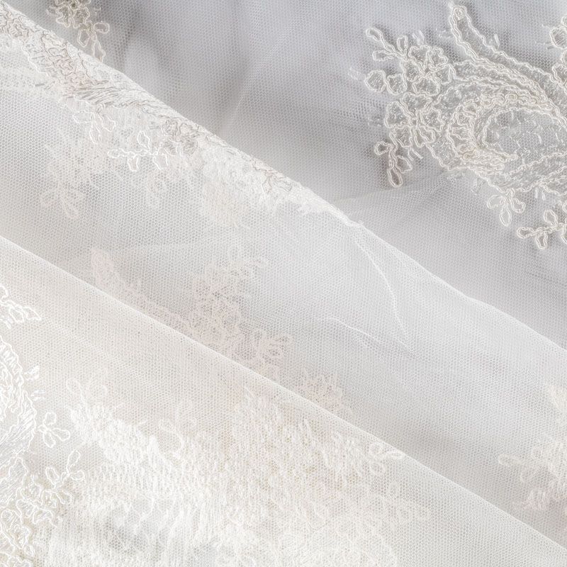 Вышивка на сетке молочного оттенка с крупным фантазийным узором в виде пера жар-птицы. Полотно мягкое, легкое и пластичное, хорошо тянется. Сетка не жесткая, приятная к телу. Узор вышит мягкой пряжей, образуя красивую фактуру, имитирующую ручную вышивку, и оформлен кордовой нитью. С обеих сторон ткань украшена симметричными фестонами, что придает полотну законченный и нарядный вид. Великолепно будет смотреться в нарядном вечернем, свадебном платье, платье на выпускной бал, в блузках, топах. Набирается для изделя объемом.