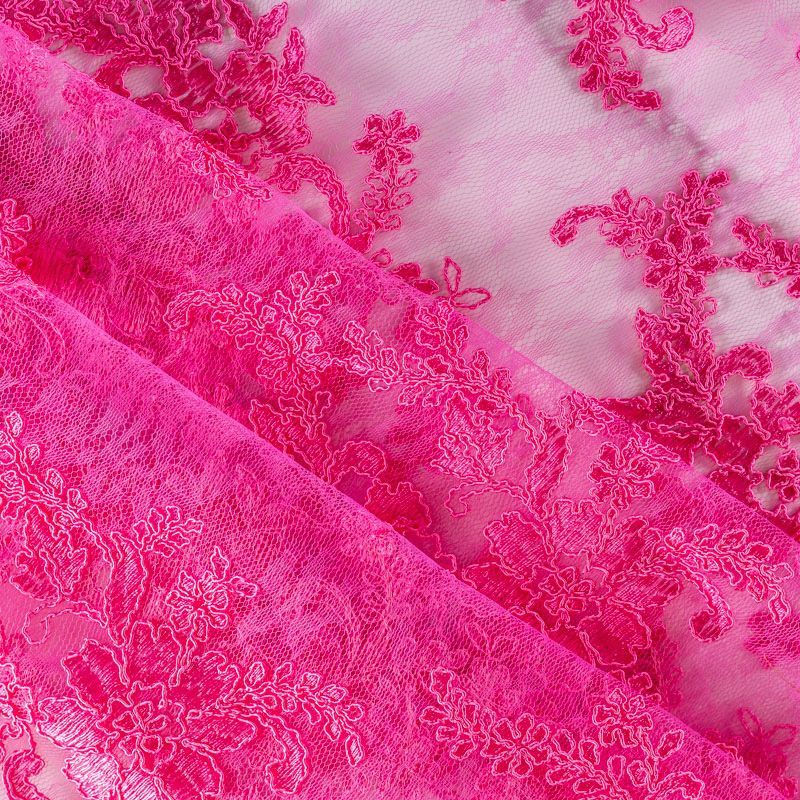 Кружевное полотно на сетчатой жаккардовой основе яркого цвета фуксии с флористическим узором. Тонкое, легкое, очень мягкое и пластичное, хорошо драпируется, приятное тактильно. Вышивка оформлена кордовой нитью. С обеих сторон ткань украшена симметричными фестонами, что придает полотну законченный и нарядный вид. Великолепно будет смотреться в нарядном вечернем, свадебном платье, платье на выпускной бал, в юбках, блузках, топах. Также можно применять отдельные элементы для декора, которые вырезаются из полотна.