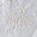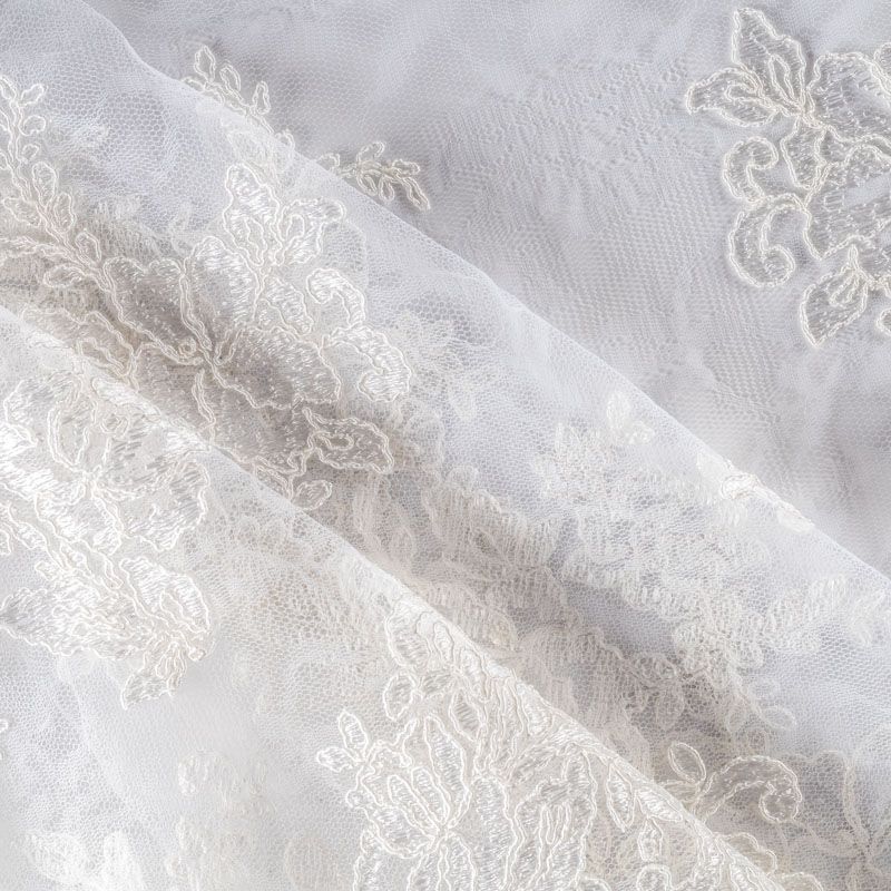 Кружевное полотно на сетчатой жаккардовой основе белого цвета с флористическим узором. Тонкое, легкое, очень мягкое и пластичное, хорошо драпируется, приятное тактильно. Вышивка оформлена кордовой нитью. С обеих сторон ткань украшена симметричными фестонами, что придает полотну законченный и нарядный вид. Великолепно будет смотреться в нарядном вечернем, свадебном платье, платье на выпускной бал, в юбках, блузках, топах. Также можно применять отдельные элементы для декора, которые вырезаются из полотна.