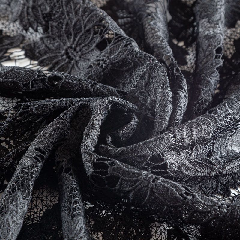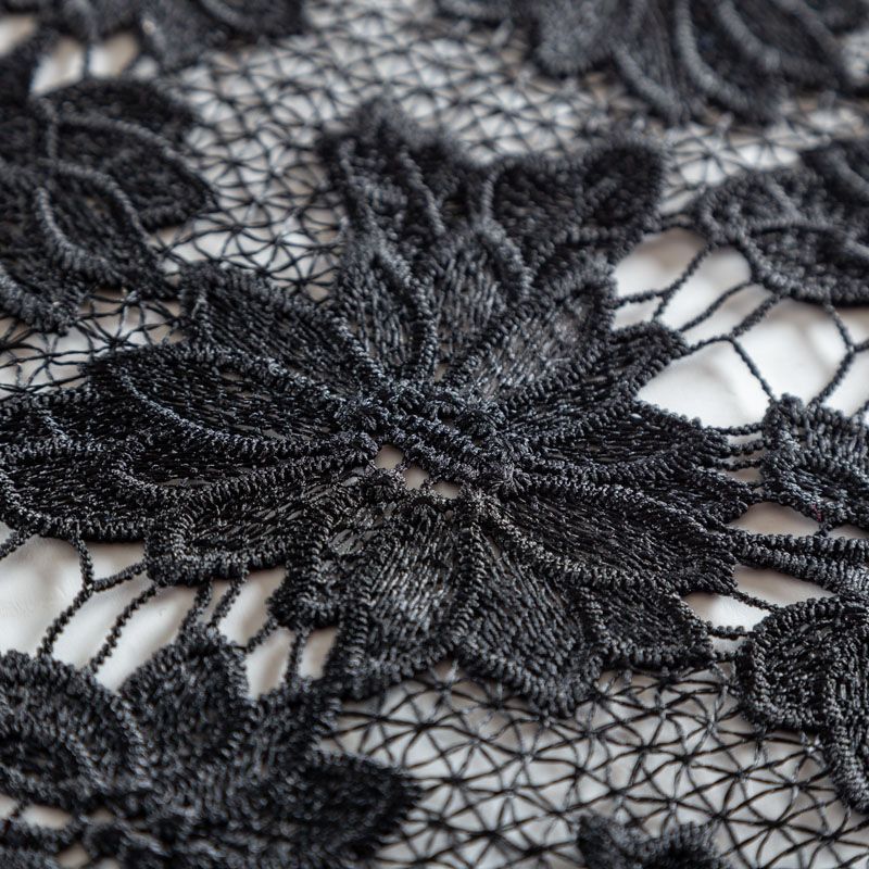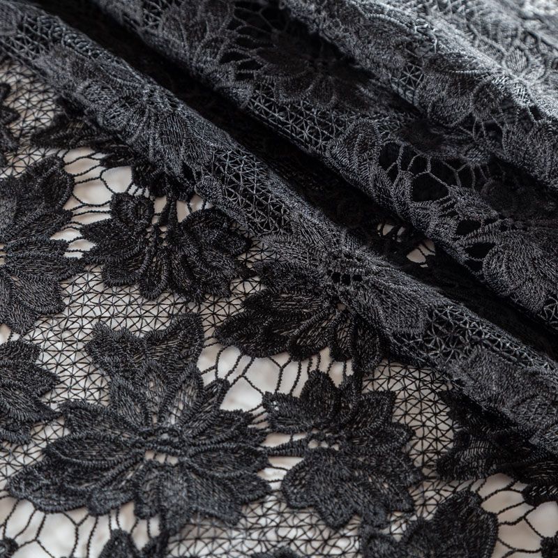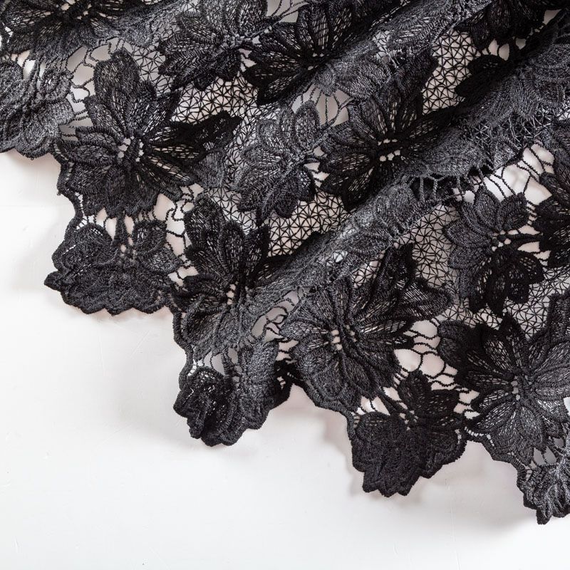 Гипюр-макраме представляет собой ажурное полотно, имеющее рельефную текстуру с цветочным ажурным плетением по всей ширине и фестонами по обе стороны кромок. Материал прозрачный на теле и на просвет, требуется подклад. Всегда актуален при создании утончённых и роскошных нарядов, придавая им дороговизны и оригинальности. Может использоваться для пошива платьев, костюмов прямого кроя, изготовления декоративных элеметов. Набирается на изделие объемом.