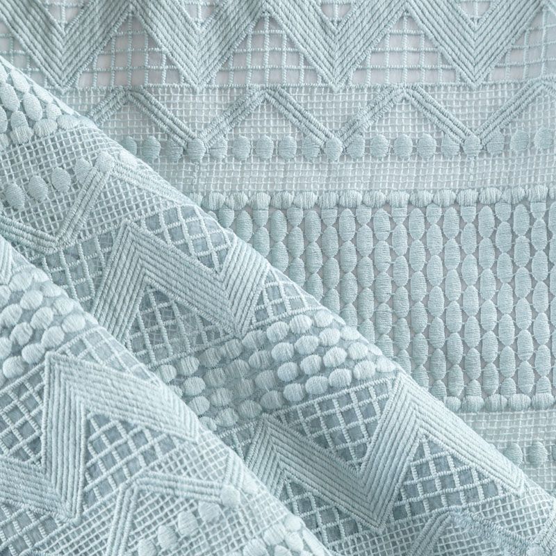 Итальянский гипюр-макраме серо-голубого оттенка на основе из органзы представляет собой полотно с рельефной текстурой с геометрическим ажурным плетением по всей ширине. Материал прозрачный на теле и на просвет, требуется подклад. За счет основы отлично держит форму. Всегда актуален при создании утончённых и роскошных нарядов, придавая им дороговизны и оригинальности. Может использоваться для пошива платьев, сарафана, костюма прямого кроя, топа, легкого кардигана, изготовления декоративных элеметов. На изделие набирается объемом.