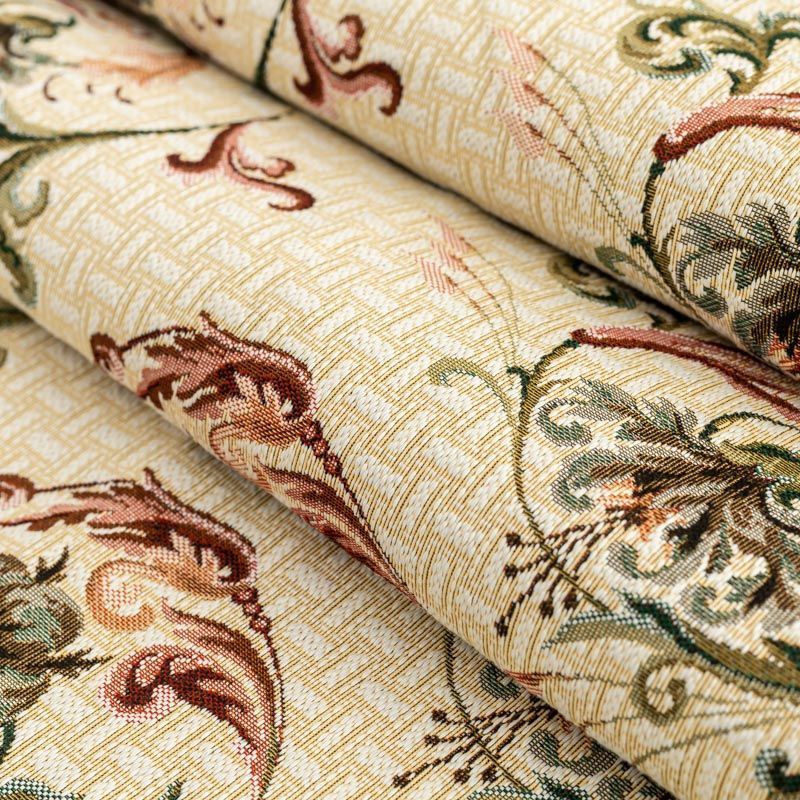 Гобелен представляет собой ткань, выполненную  перекрестным плетением нитей с одномоментным созданием сюжетной или орнаментальной композиции. Это плотный материал высокую прочность и износостойкость. Гобелен используют для пошива плотных светонепроницаемых штор, декоративного домашнего текстиля и аксессуаров, в мебельном производстве для обивки мебели. Так же применяется в рукоделии: модные кошельки, сумочки, пояса и другие аксессуары и при изготовлении дизайнерской одежды. На спокойном песочном фоне цветное разнообразие фантазийных колокольчиков.
