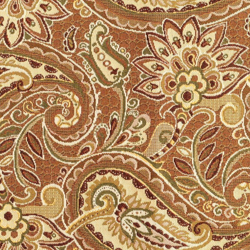 Гобелен представляет собой ткань, выполненную  перекрестным плетением нитей с одномоментным созданием сюжетной или орнаментальной композиции. Это плотный материал высокую прочность и износостойкость. Гобелен используют для пошива плотных светонепроницаемых штор, декоративного домашнего текстиля и аксессуаров, в мебельном производстве для обивки мебели. Так же применяется в рукоделии: модные кошельки, сумочки, пояса и другие аксессуары и при изготовлении дизайнерской одежды. На коричнево-песочном фоне растительный цветной узор в стиле пейсли.