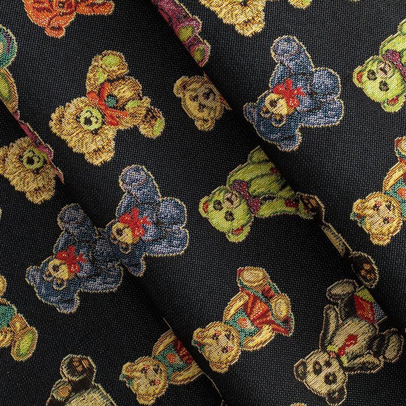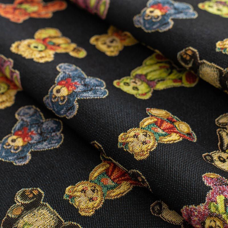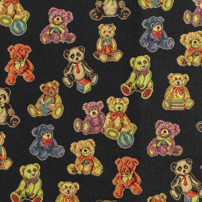 Гобелен представляет собой ткань, выполненную  перекрестным плетением нитей с одномоментным созданием сюжетной или орнаментальной композиции. Это плотный материал высокую прочность и износостойкость. Гобелен используют для пошива плотных светонепроницаемых штор, декоративного домашнего текстиля и аксессуаров, в мебельном производстве для обивки мебели. Так же применяется в рукоделии: модные кошельки, сумочки, пояса и другие аксессуары и при изготовлении дизайнерской одежды. На черном фоне всеми любимые разноцветные игрушки - мишки-тедди.