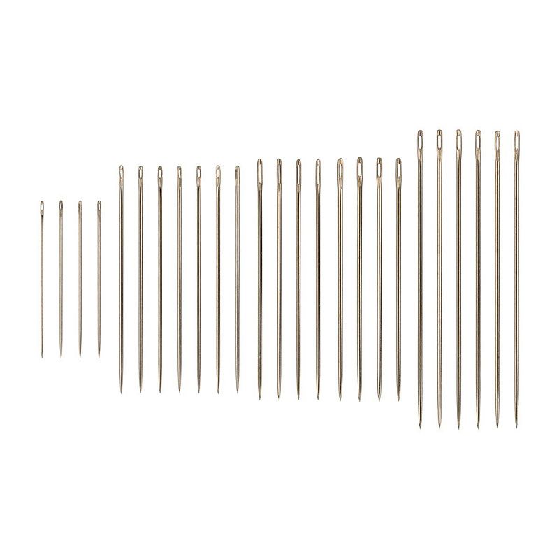 Набор игл для ручного шитья и наметки, вышивания, штопки. Иглы сделаны из высокоуглеродистой стали с идеальной гладкой поверхностью и никелированным покрытием, которое защищает иглу от коррозии и окисления. Ушки внутри игл отполированы и не имеют зацепок, поэтому нить не будет рваться при работе. Размер игл: 0.53x27.0 - 4шт; 0.71x39 - 7шт; 0.84x42 - 4шт; 0.84x51 - 6шт; 0.76x41.5 - 4шт.