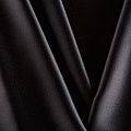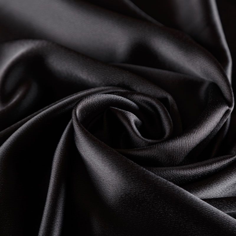 Итальянская ткань кади черного оттенка. Кади — это креп-атлас с красивым глянцевым блеском. Ткань с плотной фактурой, роскошно ниспадает, очень хорошо тянется, изумительно садится по фигуре и шикарно смотрится в изделии. Она хорошо драпируется, эффектно облегает. Подходит для пошива удлиненных платьев с драпировками, платья-футляра, брюк палаццо, юбки-карандаш, жакета, туники, кроп-топа, а также для вечерних, свадебных и  выпускных платьев и костюмов.