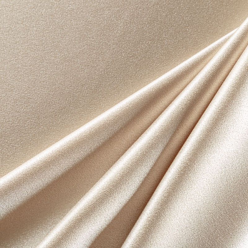 Итальянская ткань кади светло-золотистого оттенка. Кади — это креп-атлас с красивым глянцевым блеском. Ткань с плотной фактурой, роскошно ниспадает, очень хорошо тянется, изумительно садится по фигуре и шикарно смотрится в изделии. Она хорошо драпируется, эффектно облегает. Подходит для пошива удлиненных платьев с драпировками, платья-футляра, брюк палаццо, юбки-карандаш, жакета, туники, кроп-топа, а также для вечерних, свадебных и выпускных платьев и костюмов.