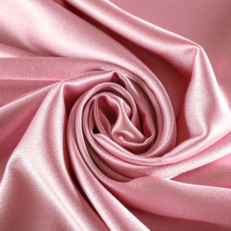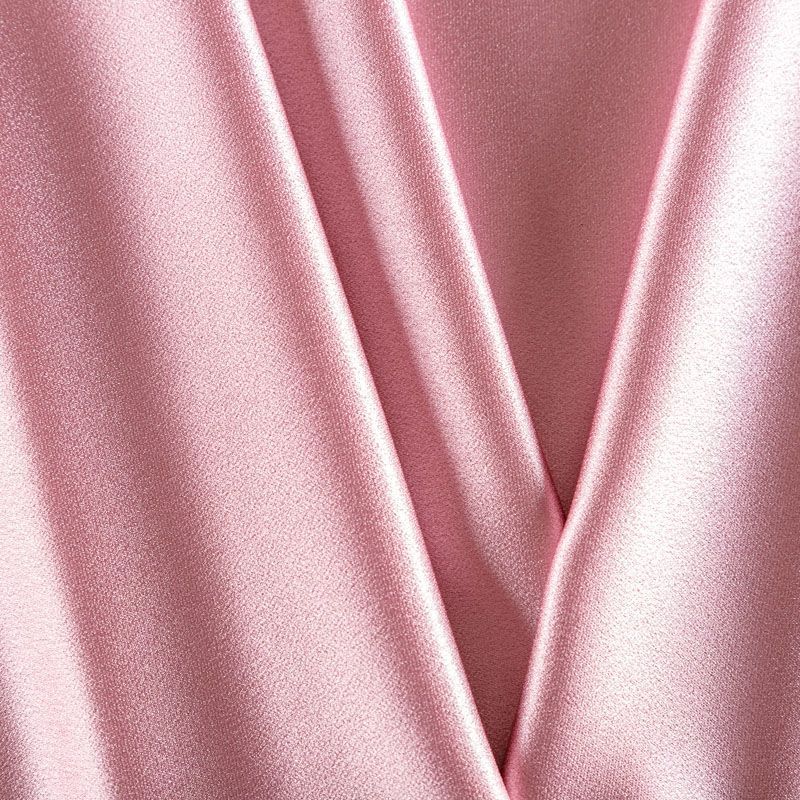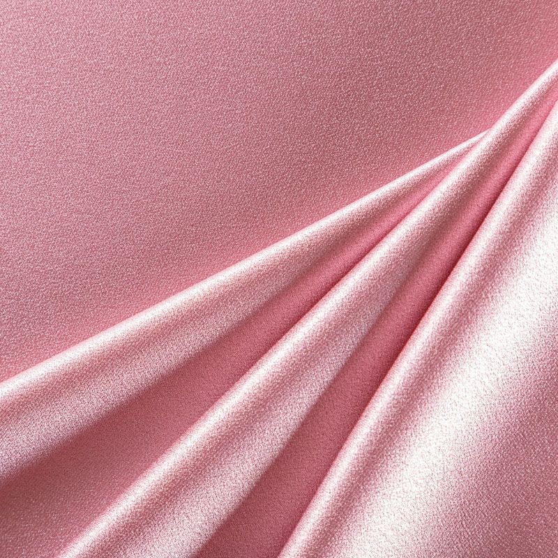 Итальянская ткань кади розового оттенка. Кади — это креп-атлас с красивым глянцевым блеском. Ткань с плотной фактурой, роскошно ниспадает, очень хорошо тянется, изумительно садится по фигуре и шикарно смотрится в изделии. Она хорошо драпируется, эффектно облегает. Подходит для пошива удлиненных платьев с драпировками, платья-футляра, брюк палаццо, юбки-карандаш, жакета, туники, кроп-топа, а также для вечерних, свадебных и  выпускных платьев и костюмов.