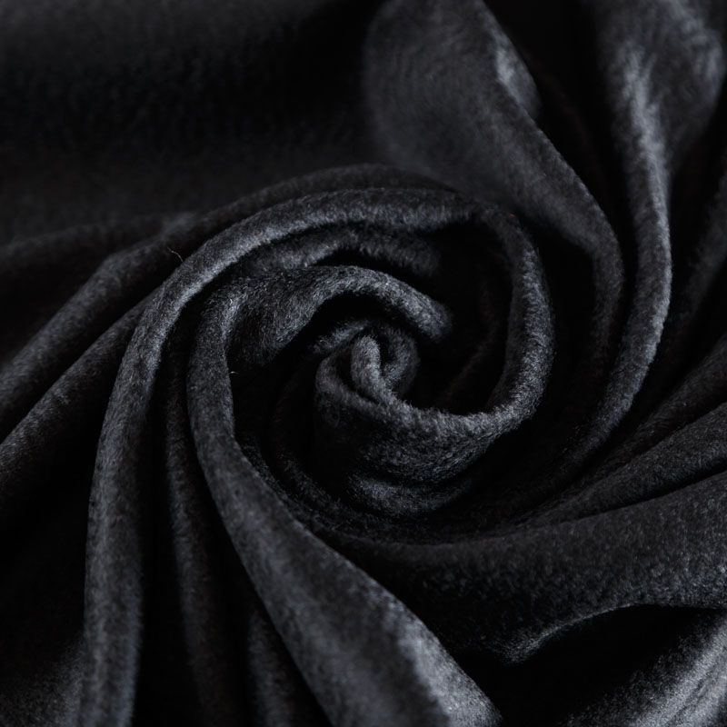 Итальянский пальтовый кашемир в черном цвете. Ткань необычайно мягкая, приятная на ощупь, гибкая, средней толщины. Поверхность имеет короткий ворс и красивый, неповторимый, присущий кашемирам шелковистый отлив. Подойдет для пошива пальто, куртки, жакета, парки, кейпа, жакета или пончо.
