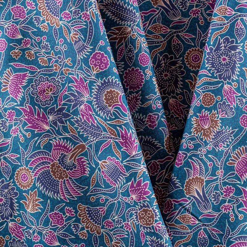 Плательно-рубашечный натуральный хлопок со стилизованным растительным принтом в синих, розовых и коричневых тонах на сложном сине-зеленом фоне. Ткань имеет плотное переплетение, матовую гладкую поверхность, хорошо держит форму, не прозрачная. Подойдет для пошива рубашек, платья-рубашки, юбки, сарафана, туники, домашней одежды.