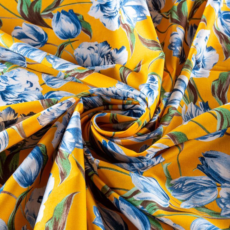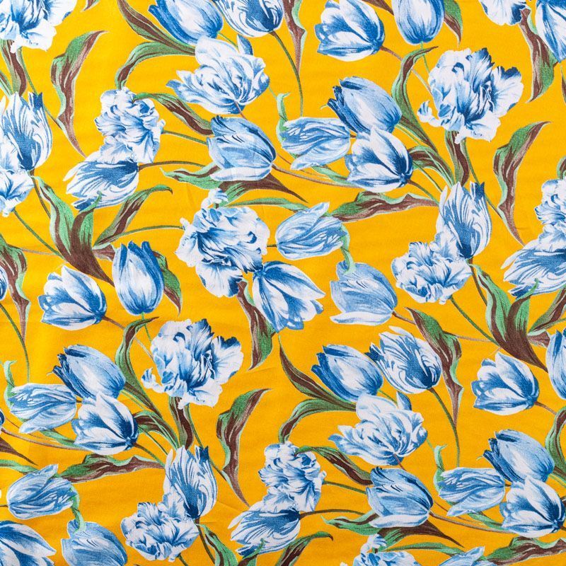 Плательно-рубашечный натуральный хлопок с крупным цветочным принтом в  голубых оттенках на насыщенном желтом фоне. Ткань имеет плотное переплетение, матовую гладкую поверхность, хорошо держит форму, не прозрачная. Подойдет для пошива рубашек, платья-рубашки, юбки, сарафана, туники, домашней одежды.