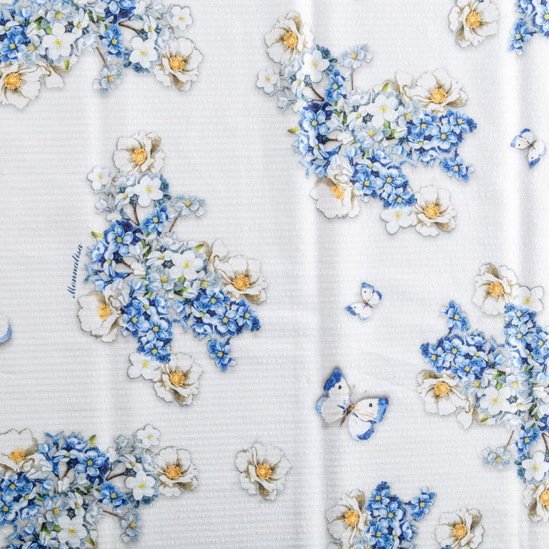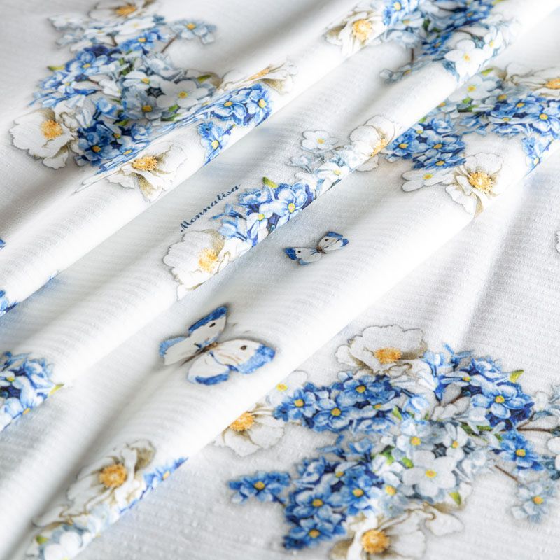 Плательно-рубашечный жаккардовый хлопок от бренда Monnalisa с цветочным летним принтом в сине-голубых оттенках. Ткань пластичная, легкая, немного просвечивает, поверхность гладкая, приятная на ощупь. Подойдет для пошива платья, рубашек, платья-рубашки, юбки, сарафана, туники, комбинезона, домашней одежды.